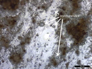 Each experimental flake was handled with care to prevent contamination from hands and cross-contamination between samples. This enabled us to limit the introduction of skin flakes from bare hands, which Pedergnana et al. (2016) recently identified as common contaminants on stone tools. Likewise, we did not use modelling clay. Blu-Tack® was instead used as the base support material during microscopic examination of the experimental flakes. We know that Blu-Tack®; can transfer to the flint, and can also stick to and remove residues from the stone surface. To prevent contamination or loss of residues, the microscope stage was prepared by placing a bed of Blu-Tack®; on the stage and then overlaying a new layer of plastic paraffin film (Parafilm M®) to create a fresh unused surface that separated the mouldable Blu-Tack®; from each flake. Parafilm M® was chosen instead of cling film to place on top of the Blu-Tack®; for the mounting surface because it is flexible and able to withstand stress without tearing or puncturing. Thus, the experimental flakes never came into contact with the Blu-Tack®. The paper-covered side of the parafilm was removed and placed facing upward to be in contact with the specimen and the parafilm was orientated by touching the edges only. Each flake was placed on the microscope stage and manoeuvred using a new powder-free glove each time. These procedures helped to minimise, but did not eliminate, the presence of modern contaminants. For example, blue and pink fibres from clothing were sometimes observed, and starch granules within the glue of the double-sided tape used to mount soil samples on slides were found (Figures 9 and 10).