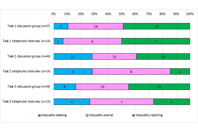 Distributional preferences varied by domain and cause of inequality but not digital status. Health inequality caused by financial inequality was widely unaccepted. Some preferred equal distributions, even when violating ‘monotonicity’, citing fairness and social cohesion.
